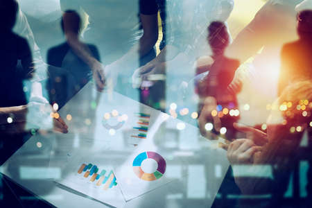 Team of people work together in office. Concept of teamwork and partnership. Double exposure