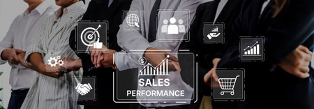 Group of business professionals working together to enhance sales performance. They analyze growing metrics and develop effective strategies for achieving success.
