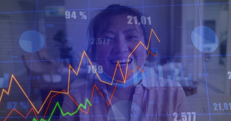 Image of financial data processing over biracial businesswoman working at office. Global business, finances and digital interface concept digitally generated image.