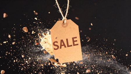Exploding price tag with SALE shrapnel, slow motion capture against dark background, copy space for text for shopping or discount advertisement