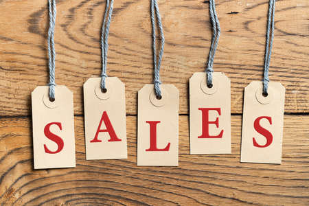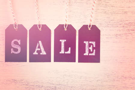 Tags with sale sign on wood board.