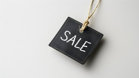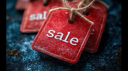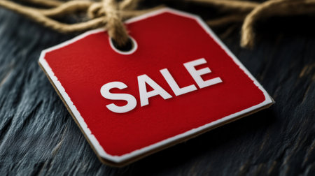 A vibrant red sale tag dangles prominently in the foreground, contrasting with a soft, blurred dark backdrop, enticing potential buyers. This visual hints at exciting shopping opportunities.