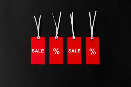red tags with discount signs on black background