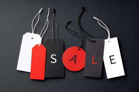 Tags with the word sales in red color, dark textured background, empty copy space