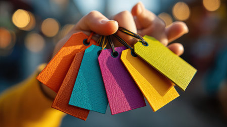 A hand displays vibrant, colorful tags in various shapes, held at a busy outdoor market.