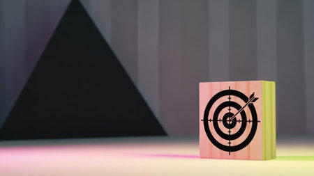 This image features a wooden block with a target symbol on it. The target symbol consists of concentric circles with an arrow pointing to the center. The wooden block is placed on a surface with a gradient background ranging from light pink to yellow. The image is set on a transparent background, making it suitable for various design applications.