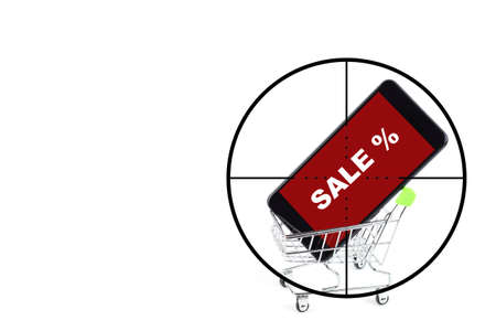 Smartphone in a shopping cart with the inscription SALE in the form of a target on a round sight, isolate on white.
