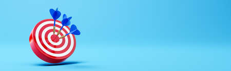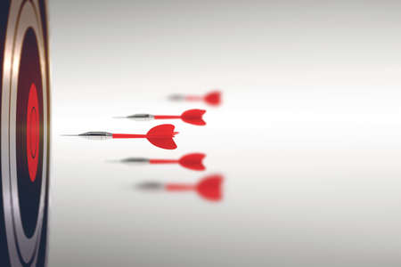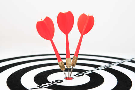 Close up shot of the dart arrow hit on bullseye, red dart arrow hitting in the target center of dartboard Target hit in the center, challenge in business marketing,Target and goal as concept.