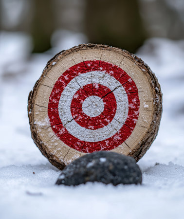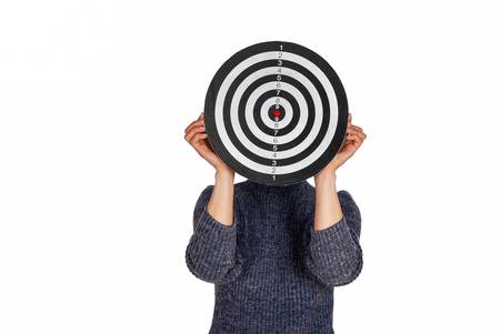 A hand holding a wooden target with a red arrow pointing to the center. Concept of aiming for a goal or target, and the importance of focus and determination in achieving it