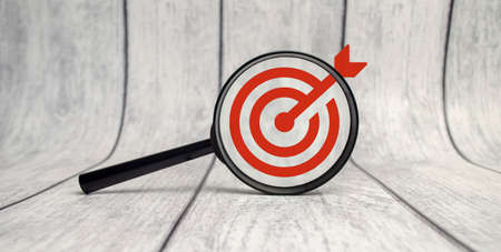 Target board inside of magnifier glass for focus business objective on wooden background and copy space.