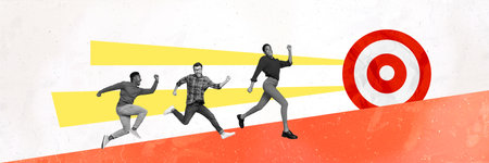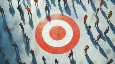 A bullseye target sits at the center, surrounded by a diverse group of individuals.
