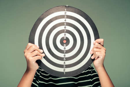 Close up of businessman hand holding dart and dartboard with dartboard on the background