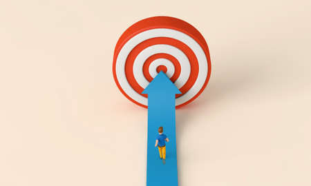 Cartoon style character running up a direction arrow to a target. 3D Rendering