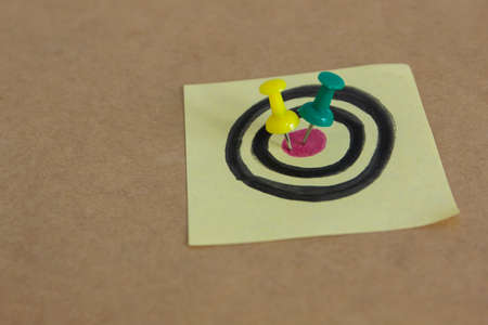 Target board with arrows on yellow background, target on word letters cube, success concept