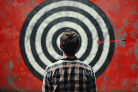 Man is standing in front of an archery target board with an arrow missing the bullseye