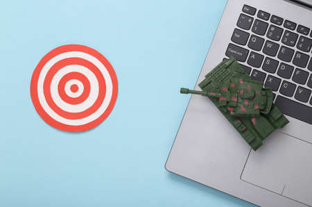 Tank with pc mouse and target on green background. Antivirus, system protection. top view