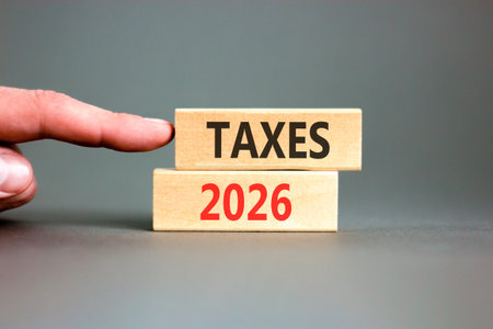 Taxes 2026 new year symbol. Concept words Taxes 2026 on beautiful wooden blocks. Beautiful gray paper background. Businessman's hand. Business and taxes 2026 new year concept. Copy space.