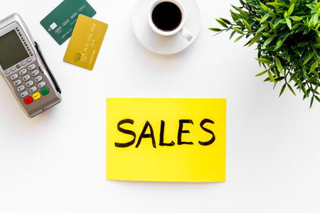 Sales sing on white background with POS payment terminal and credit cards, top view. Online shopping concept.