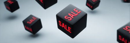 Black cubes with red sale text appear to float in a minimalistic background, representing special promotional offers and discounts in a modern retail setting.