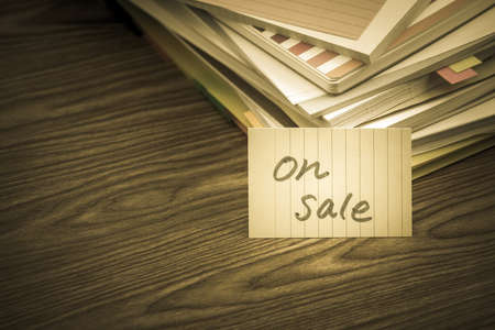 Close-up of red Sale tags stacking on table, modern labels for shops and stores