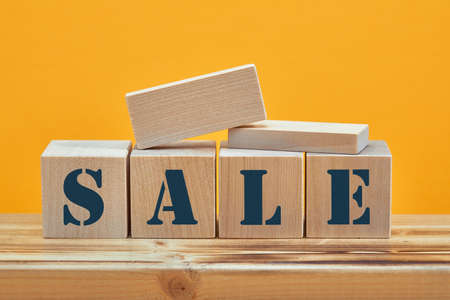 wooden blocks with the wordings SALE, isolated against yellow background.