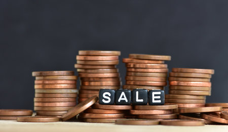 Stacked coins into columns on wooden background and word sale made of plastic beads. concept of money economics sale shops idea copy space