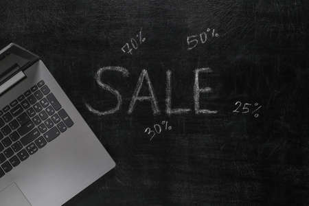 Sale word chalk hand drawn on blackboard with laptop. shop online. seasonal discount concept