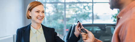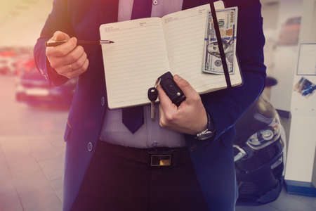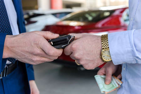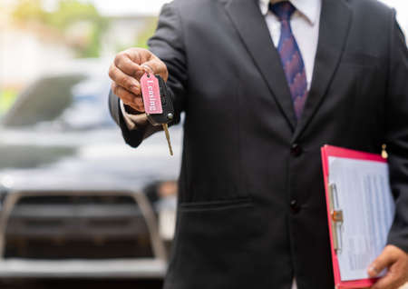 Car key, Saleman handing over gives the car key on out of focus car background.