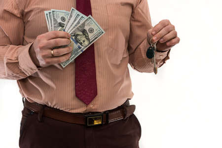 Businessman holding dollars and apartment keys isolated on white. Renting or buying a home. money.
