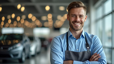 A man wearing a blue shirt and a gray apron stands confidently in a sleek car showroom. He smiles warmly while showing his skills in the automotive industry.