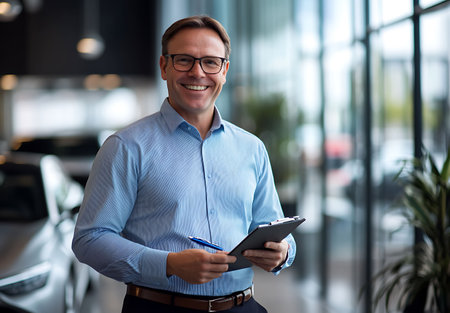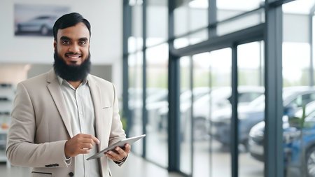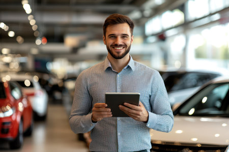 Professional car salesman holding tablet and smiling inside a modern dealership, representing automotive sales, service, and customer care.