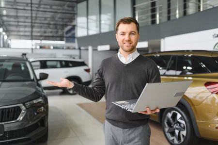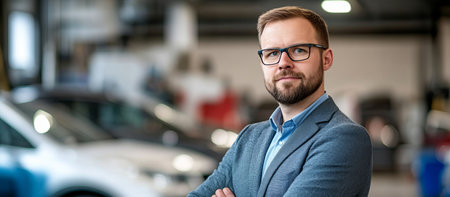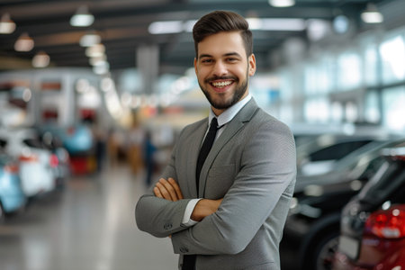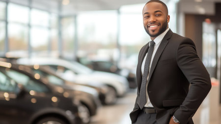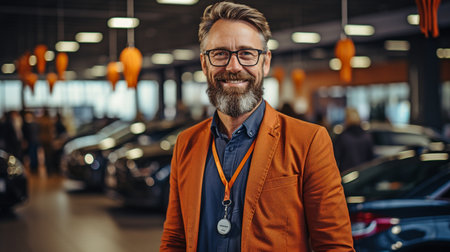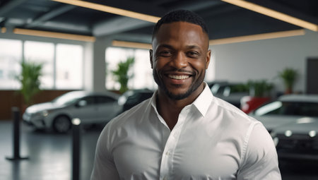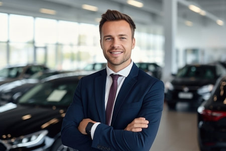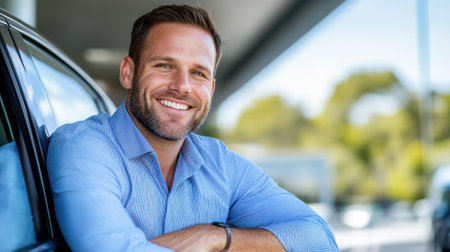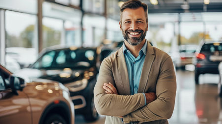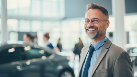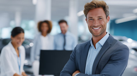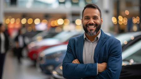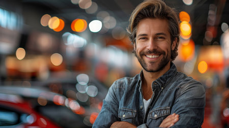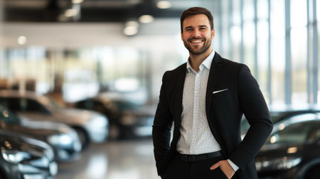 A cheerful and attractive man confidently poses in a bright car showroom. The vibrant background and his positive demeanor convey success and friendliness, creating an inviting atmosphere.