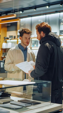 Two Men Discussing Purchase Details in Modern Retail Store.