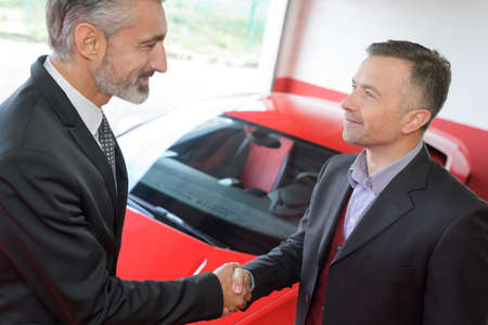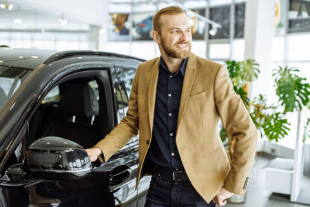 happy caucasian guy now the owner of business class auto. man make purchase in dealership, his new representative car stand next to him
