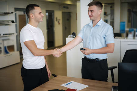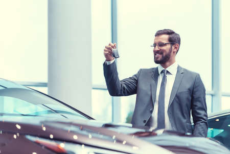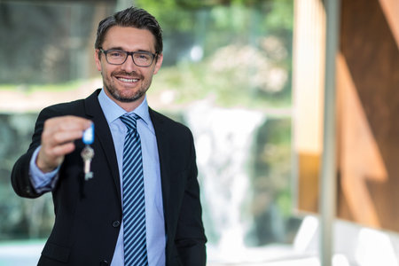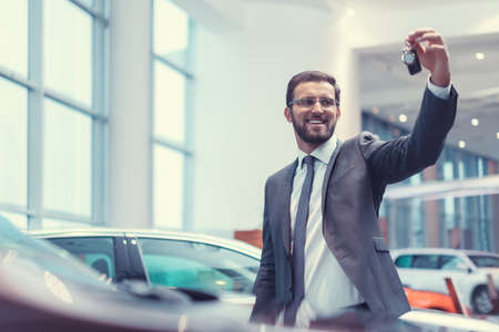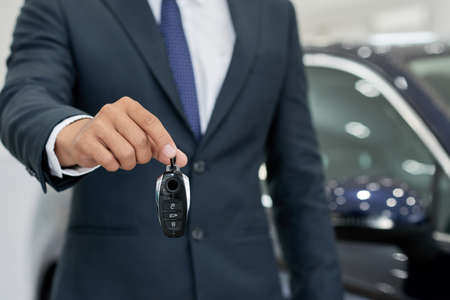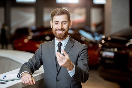 Portrait of a happy sales manager or businessman holding car key, feeling excited about selling or buying a new car at the car dealership