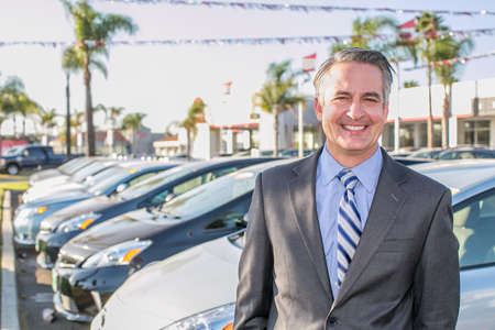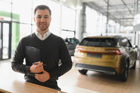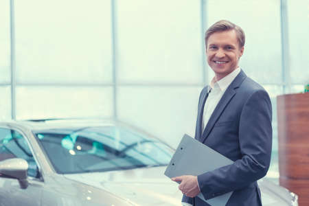 Handsome car dealership worker in suit is holding a folder, looking at camera and smiling while standing near the car