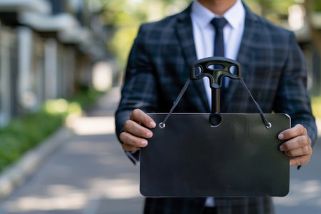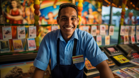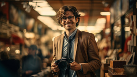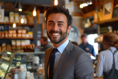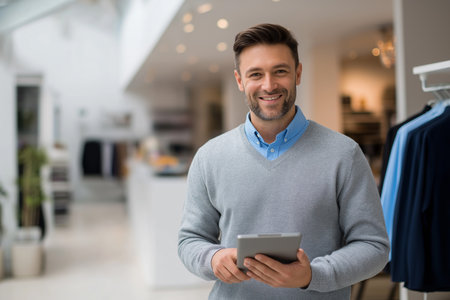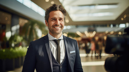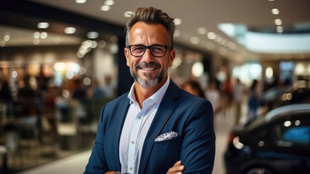Explore the world of business leadership with this adult smiling representative man, set against the backdrop of a bustling shopping center. This image showcases the professionalism and confidence of a corporate leader, ready to navigate the challenges of the business world.