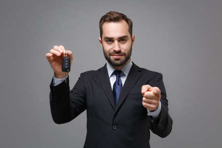 Young business man in classic black suit shirt tie posing isolated on grey background. Achievement career wealth business concept. Mock up copy space. Pointing index finger on camera holding car keys.