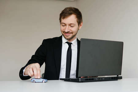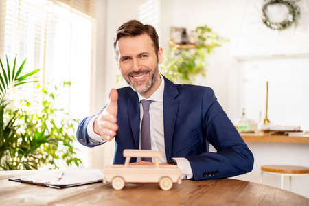 Businessman, car dealer smiling to the camera, handshaking the agreement. The wooden car's model on the desk. Insurance details, car rental. Safe Vehicle Concept.
