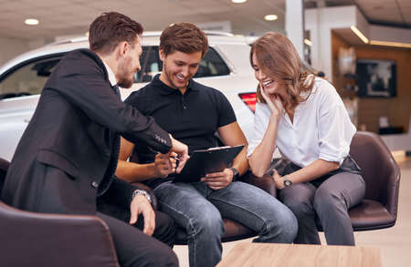 Luxury Car Salesman Presenting Contract to Interested Buyer