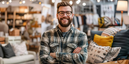 Portrait of a smiling salesman standing with arms crossed in a furniture store, proud of his work