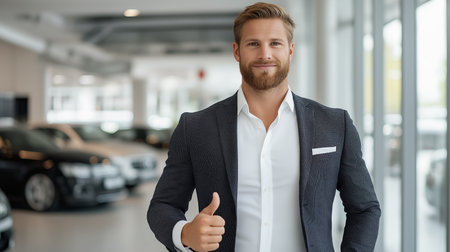 Caucasian male salesman giving thumbs up in luxury car showroom.