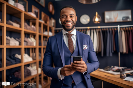 Confident young African man talking on mobile phone while sitting in fashion store office : Generative AI