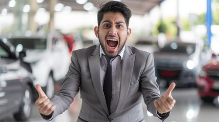 Confident Indian salesman in a suit smiling in a luxury car showroom