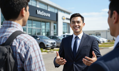 Candid photorealistic image of salesperson interacting with customers by rugged truck in dealership