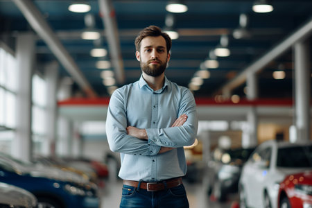 Handsome bearded man in blue shirt standing with crossed arms in modern car showroom