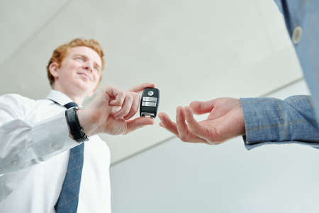 Confident young salesman showing car key at camera in modern dealership, selective focus