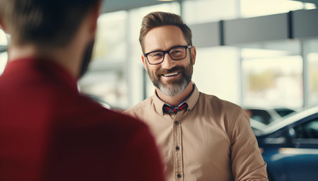Smiling young man in eyeglasses is talking with a car salesman in auto showroom.