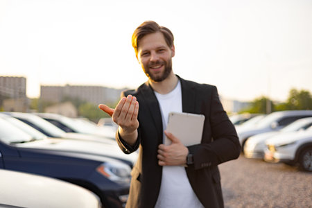 A smiling car salesman gestures towards the viewer to come closer, inviting them to look at the cars parked in the background.