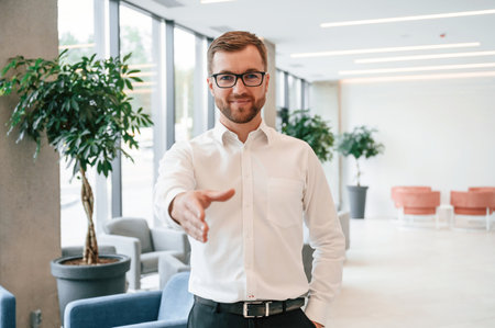 Giving hand to make handshake. Elegant man in formal clothes is indoors.